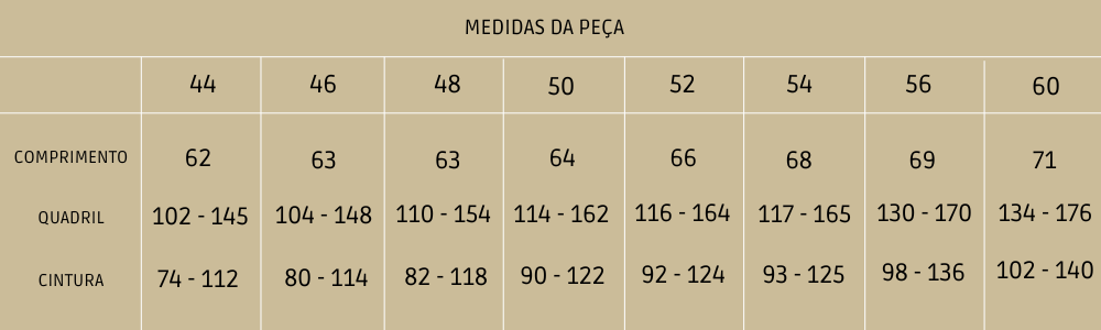 Medidas da modelo: Altura 1,60 m / Busto 104 cm / Cintura 90 cm / Quadril 136 cm