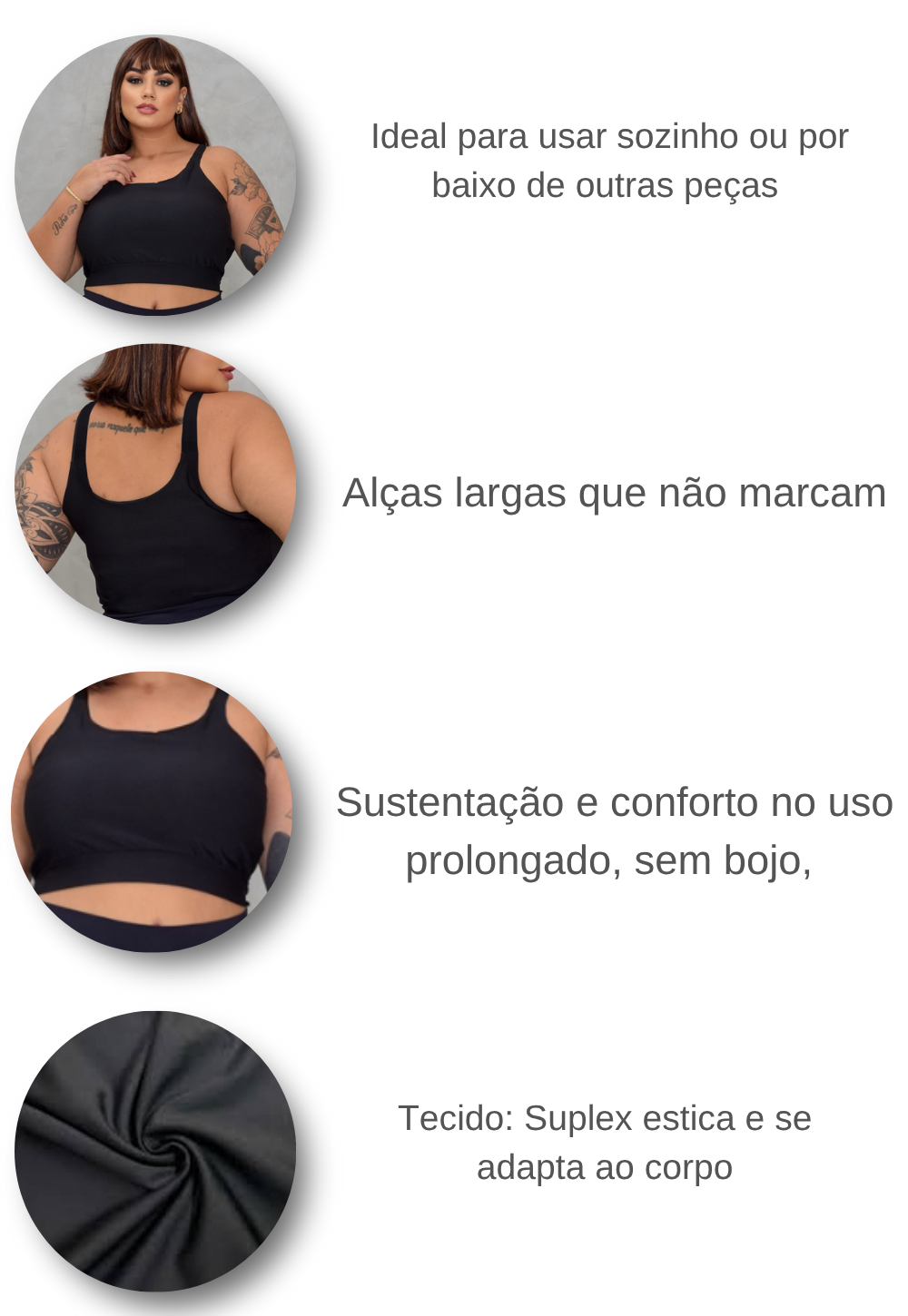 Seja para compor um look fitness, usar sob uma camisa transparente ou apenas garantir um conforto extra no dia a dia, este Top Plus Size é a definição de uma peça versátil e indispensável no seu guarda-roupa.
