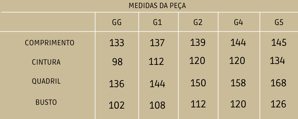 • Medidas da modelo: Altura 1,60 m / Busto 104 cm / Cintura 90 cm / Quadril 136 cm